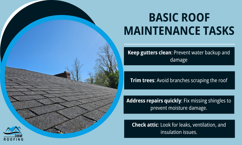 - Trim nearby trees: Prevent branches from scraping your roof or dropping debris that holds moisture